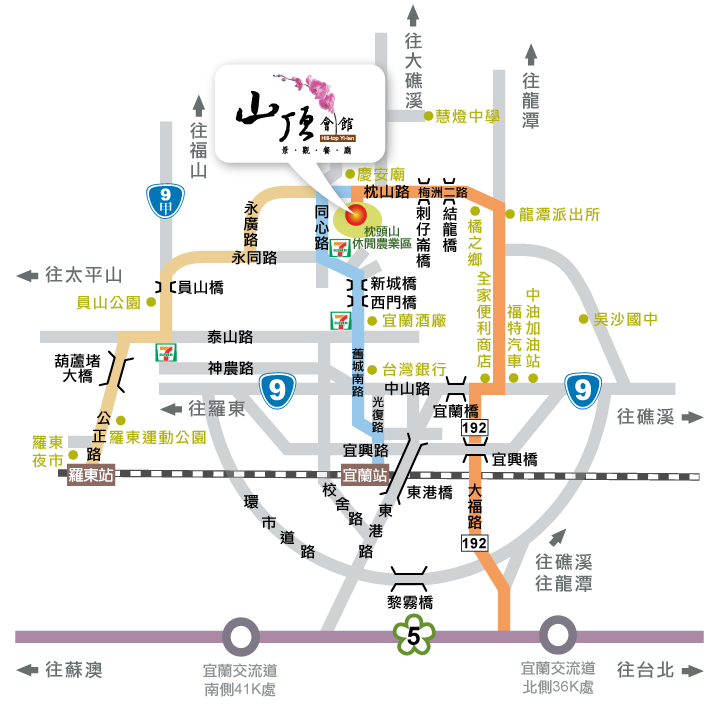 | 路線一:台北 → 國道五號 → 下宜蘭交流道 → 右轉大福路 → 右轉中山路 (台九省道) → 左轉大坡路 → 見龍潭派出所左轉梅洲二路 枕山路 → 山頂會館 | |