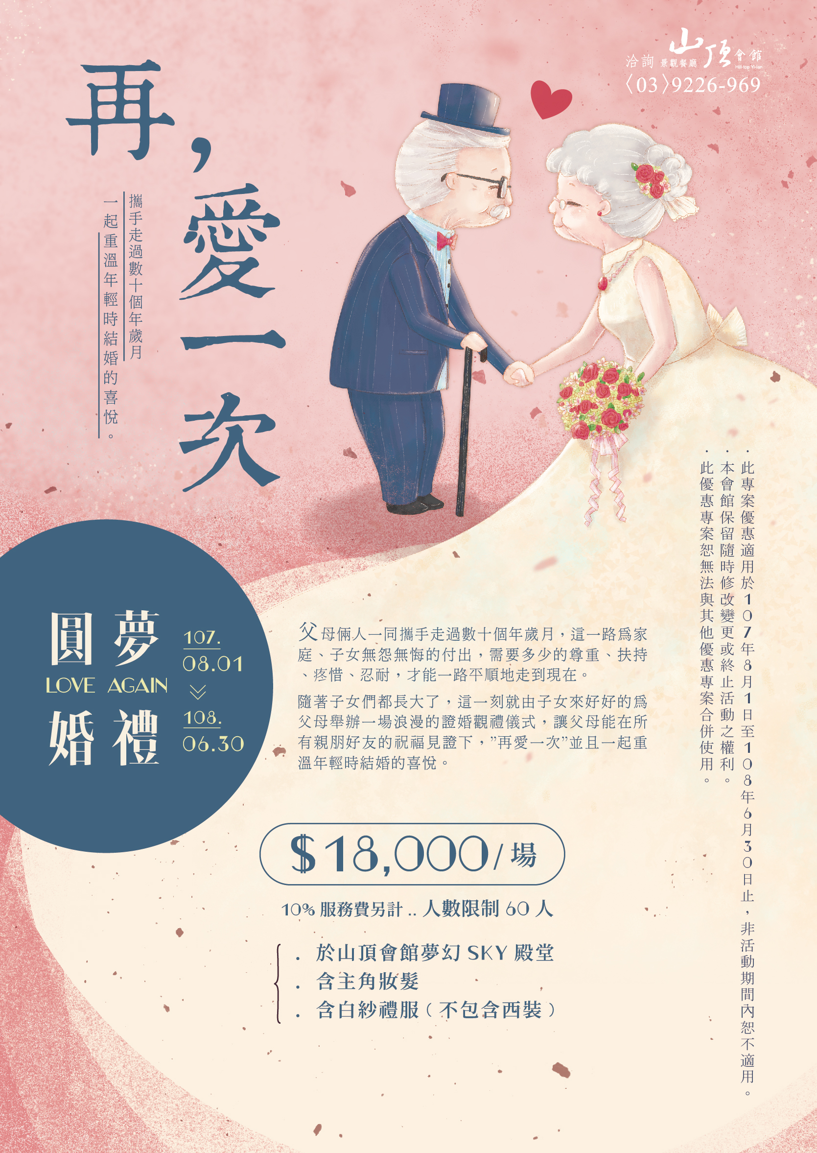 隨著子女們各個都長大了、成家立業了,這一刻就讓子女們來好好的為父母舉辦一場浪漫的證婚觀禮儀式,讓父母能在所有的子女、家人與朋友的祝福及見證下,“再愛一次”並且一起重溫年輕時結婚的喜悅。